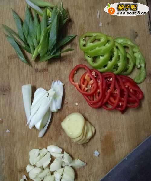2准备其他材料,青椒,红椒切圈,生姜切片,大葱斜切,大蒜拍碎,毛豆去皮洗净