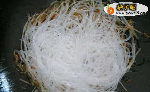 6放入泡软的粉丝,倒一碗清水或者高汤,煮至汤汁收干。