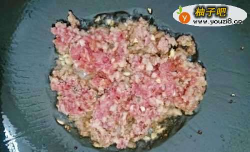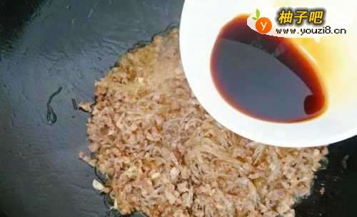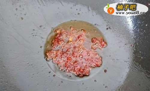 5将锅洗净后,热锅倒油,放入肉末炒散,要炒成一粒粒的状态,然后把刚才盛出的红油倒下去。