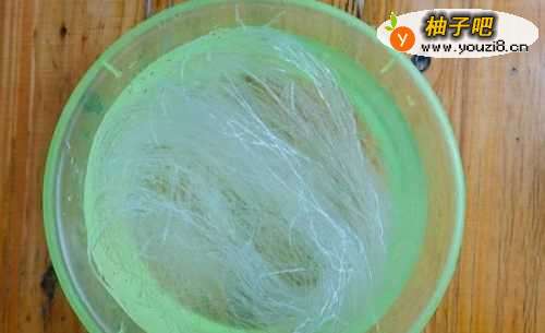 绿豆粉丝提前20分钟用温水泡软,切记不要用热水,因为热水泡出来的粉丝,烹饪的时候会黏糊糊的。泡软的粉丝沥干水分后,用剪刀稍微剪短一点,这样吃起来会方便一些。
