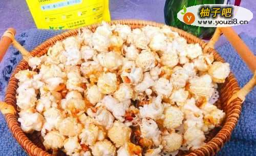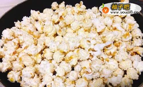8把爆米花倒进焦糖里翻拌均匀,让爆米花裹满焦糖