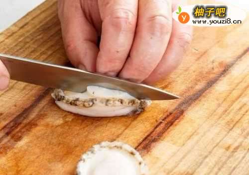 2鲍鱼洗净后,小刀贴底部将鲍鱼肉割下,在鲍鱼肉底部起浅浅的十字刀备用。