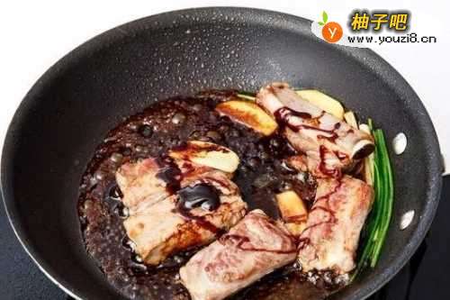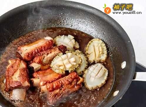 4鲍鱼焯水(在水中放少许酒去腥)水开后关火取出,加入收汁的排骨中煮至鲍鱼上色,酱汁冒泡后关火即可。