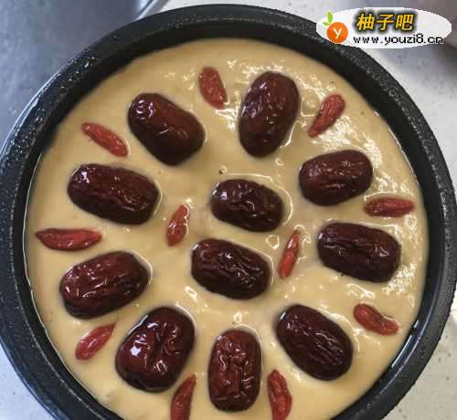 4将红枣、枸杞装点在发酵好的面糊上,此时面糊已具有弹性和承托力,红枣、枸杞会悬浮在面糊表面,而不会下沉。