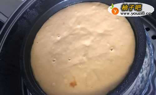 3把搅拌好的面糊倒入容器放进蒸锅,将蒸锅中水加热2-3分钟后立刻关火,盖上锅盖,利用剩余热气让面糊发酵。发酵到原有体积的1.2-1.3倍左右即可。