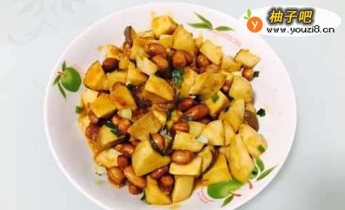 首先将花生米炸熟,杏鲍菇洗净切成丁备用。