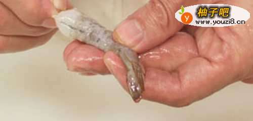 6将洗净的虾去头剥壳,横刀将筋切断。