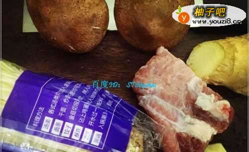 准备主要的食材:一包金针菇、两个香菇、一小块瘦肉,少许生姜、蒜头等。
