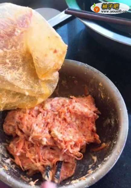 2将肉末和胡萝卜丝放在一个盆中,撒入适量盐、胡椒粉、花椒粉搅拌调味。然后放入适量面粉、清水于盆中继续搅拌,面粉不宜太多。