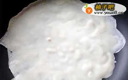 2取一平底锅倒入少许油热锅,将1/3的面糊倒入锅中,转动锅子让面糊摊平成圆饼状,以小火煎至面糊熟透成半透明状即可盛出备用。