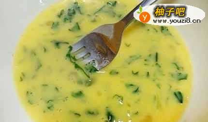 3将九层塔剪碎,与蛋液搅拌均匀。称施蹲
