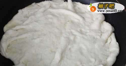 5锅中放油,油热后放入饼(我们之前说要把饼擀的比锅大,就是为了做出酱香饼的褶)。