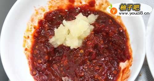 2把黄豆酱、豆瓣酱、蒜泥放在碗中备用,另外把洋葱切碎备用。