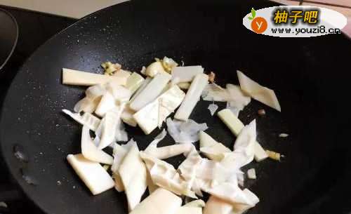 用中火烧热油,炒香蒜末、姜末、葱白后,加入切片的竹笋快炒