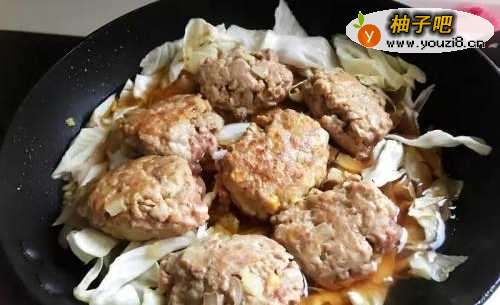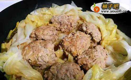 4铺上几片大片的包心菜,以保护肉丸,避免锅盖的水滴到肉丸上,盖上锅盖,用小火炖煮约1小时
