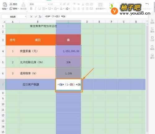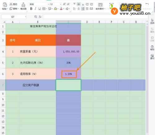 3选择单元格【C6】,根据房屋所在地的标准,输入【适用税率】。