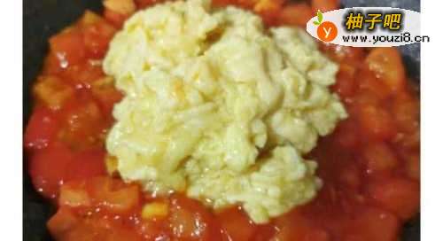 8待番茄超软后调小火,加入鸡蛋,慢慢炒匀。