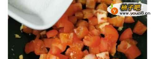 6调中火,锅里不用再放油,直接把番茄粒和糖牢夏放入翻炒。