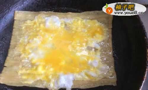 3五六成热的时候就可以放入冷面,等冷面软了之后翻过来,打一个鸡蛋,如图所示