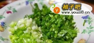 首先,我们要把葱和香菜切碎,再切一点火腿丁,如图所示