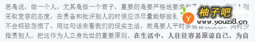 人与人相处难免会有各种矛盾与纠纷,为人处事应该多替他人考虑,多从他人的角度看待问题。所以,一旦发生了矛盾,应该多做自我批评,而不能一味指责他人的不是。责己严,待人宽,这是保持良好、和谐的人际关系所不可缺少的原则。职场中人与人相处并不像有些人说的全都是尔虞我诈、欺上瞒下,很多时候还是需要真诚相处的。同事之间产生了矛盾,不要针锋相对、一味地去挑对方的毛病,那样只会同事之间的,无利于职场和睦。首先应该检讨自我一下,自己是否有什么过错,是否对对方产生了伤害,站在他的立场上审视自己。,少一些责难,对人对己都是有益的。