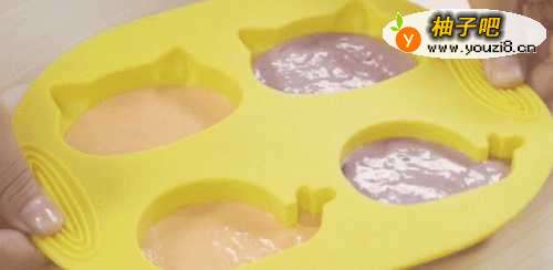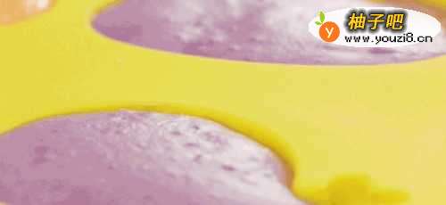 5把一半的面糊加到胡萝卜泥中,一半的面糊加到紫薯泥中,分别搅拌成粘稠不容易滑落的糊状;