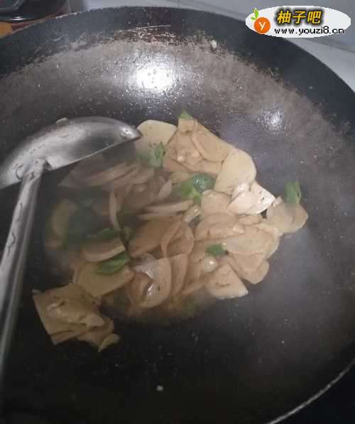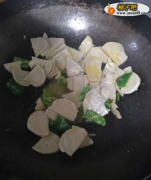 3倒入洗净的面筋片,与青椒汇合煸炒