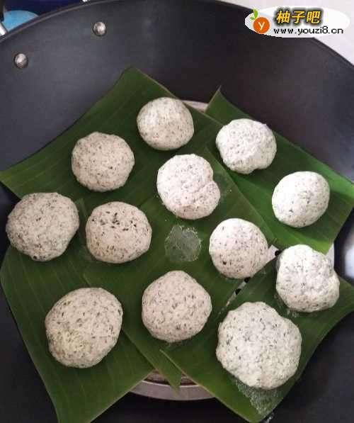6第六步:然后将做好的糯米糍放到香蕉叶子上面(也可以选用包子、馒头防粘的蒸布)这样可以避免粘锅。放入锅内蒸40分钟左右即可,如下图所示。