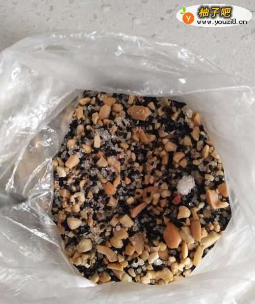4第四步:准备好混搭馅料:适量的花生米、芝麻、白糖,然后盛一小勺放到糯米上面包起来,如下图所示。