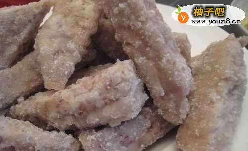 芋头去皮洗净,先切成1.5厘米的厚片,再切成宽为5厘米的条;往芋头条上洒少许盐,用手抓匀,腌制15分钟【也可以不撒,看个人喜好