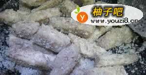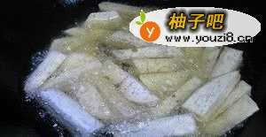 热锅内2碗油,插入竹筷待其四周起细泡时,倒入芋头条以中火炸8~10分钟