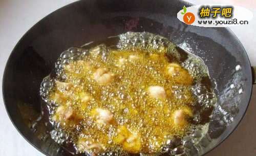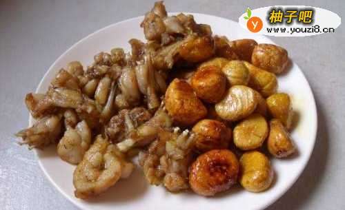 4锅里放入适量油,油热后开大火,把牛蛙和板栗放进去炸制