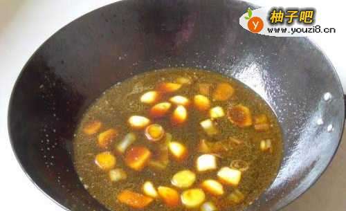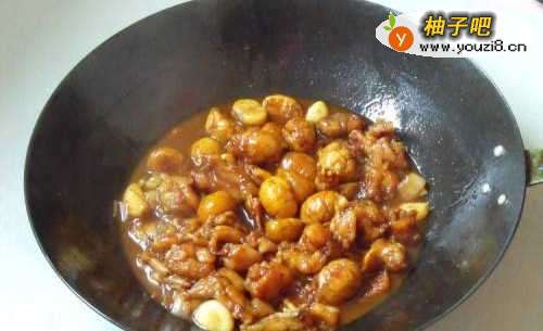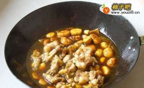 8再把板栗和牛蛙倒进去烧开,然后调至小火煮5-10分钟