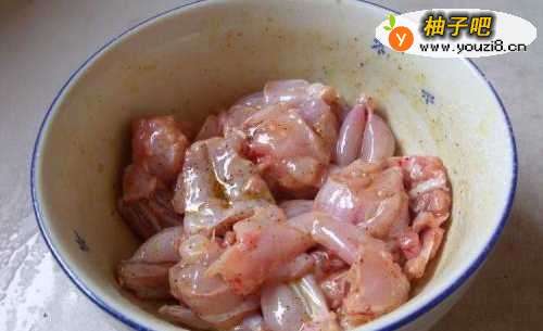 2把牛蛙洗净后切成块状,把半茶匙盐、半勺食用油、黑胡椒、干淀粉倒进去,抓匀后放进冰箱里腌制10分钟