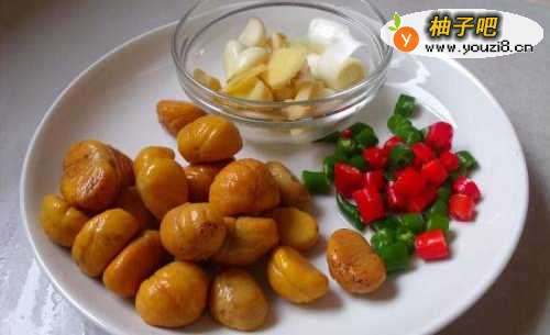 3把板栗煮熟后用冷水冲洗一遍,把姜切成片,青红尖椒切成小圈