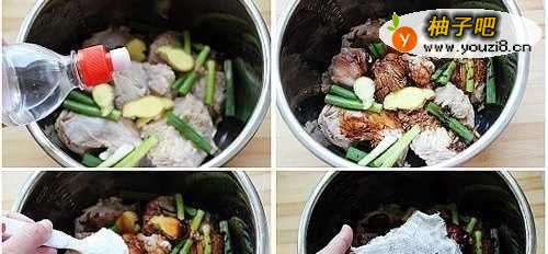 4锅里放入牛肉,加入切葱姜,倒入白酒,加入白糖,放入老抽和适量盐,最后将料包放入