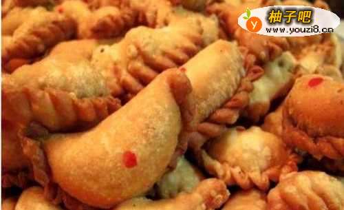 炸口酥是通过和面包裹花生馅油炸而成的,外形如月牙,吃起来口感酥脆。