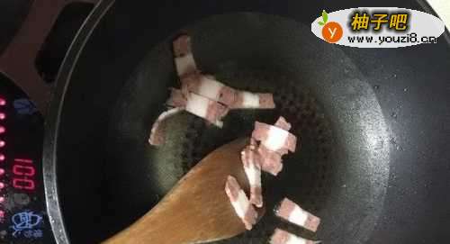 4再点火,放入培根,翻炒,待炒出培根肉香,加入荷兰豆。