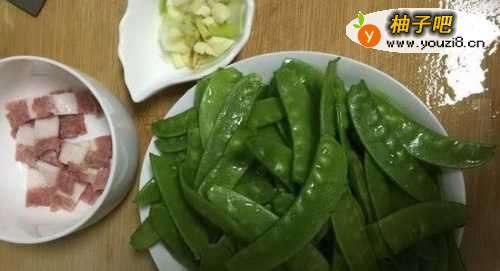 将买回来的荷兰豆去两头,清水洗净。葱姜蒜切小片,培根切片备用。