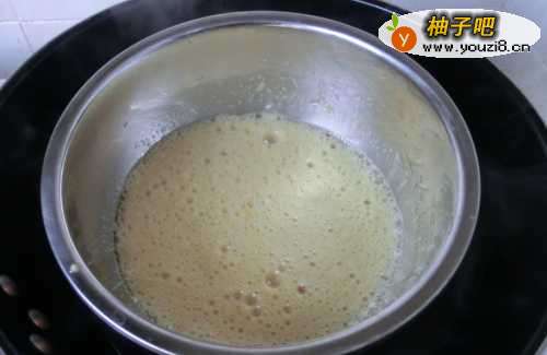 2先将蛋液打至粗泡,锅里加水烧热后关火,将鸡蛋盆放进去,也可直接将热水倒入一个大盆里,然后放上鸡蛋盆。