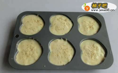 8蛋糊倒入模子中,8分满,6联模一套撒上少许白芝麻点缀。