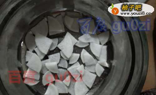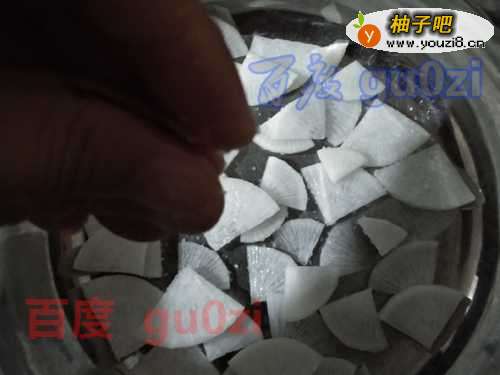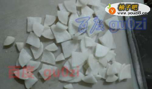 2整个对半切开,再分别对半切开,然后,切成小片块,不要太薄,