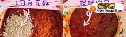 3再放进一勺白芝麻,然后混合均匀,这就是我们的酱汁了