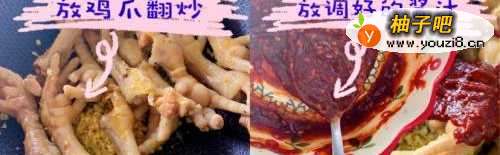 5蒜末炒香以后,我们把鸡爪放进去翻炒,再放入调好的酱汁,然后用三碗清水倒进去大火收汁