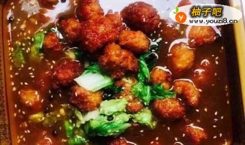 (准备好中号碗,酱油,大蒜末、姜末、花椒油、豆粉5g,加入温开水加多点,搅拌好佐料备用)倒入色拉油、八成熟下入炸好的肉丸,直到肉丸柔软后,倒入准备好的佐料淋入锅中,