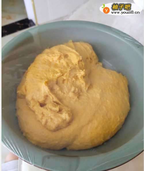 4搅拌完成后,放入碗中,盖保鲜膜发酵至两倍大,大概需要2个小时。然后揉成面团。