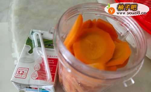 准备一根胡萝卜,削皮切片。放入榨汁杯中,加入牛奶榨成汁。
