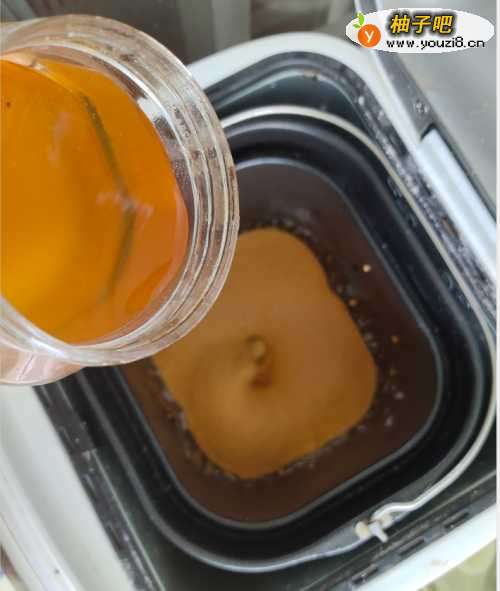 3面包机搅拌到一定程度,加入少量蜂蜜,一小勺盐和黄油,继续搅拌。