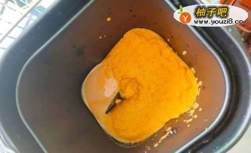2将胡萝卜汁倒入面包机内胆,然后打两个鸡蛋,根据个人喜好加适量的白糖,面粉,酵母粉。