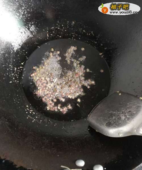 4第四步,在铁锅中倒入适量花生油,等油七八分熟以后倒入干花椒和青花椒翻炒,然后把炒干的花椒滤出。